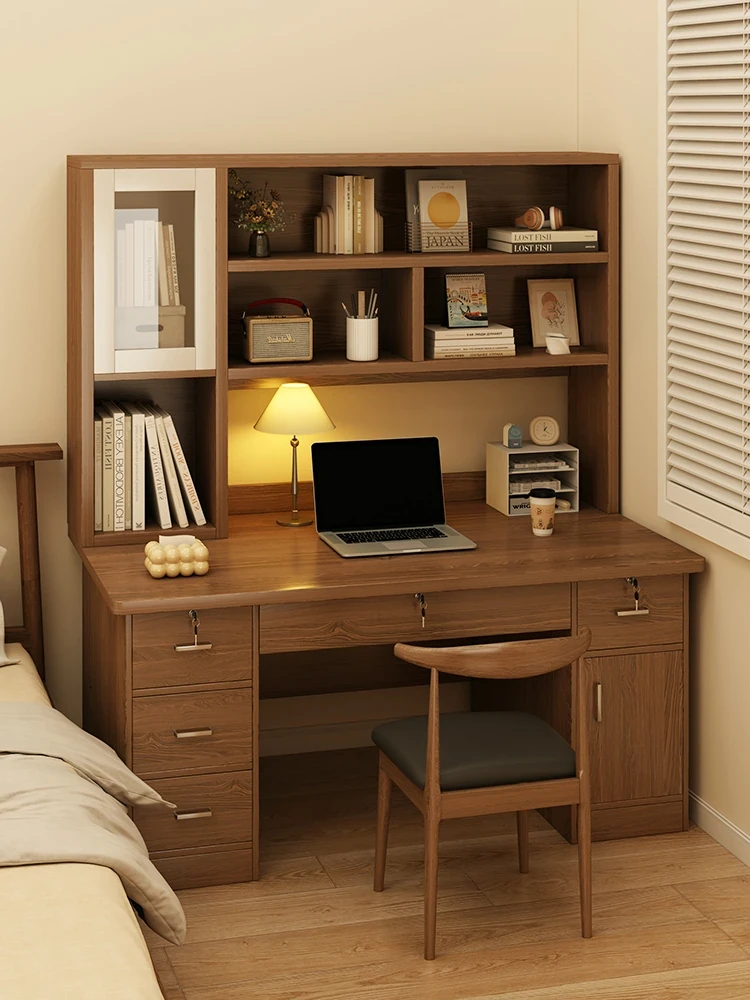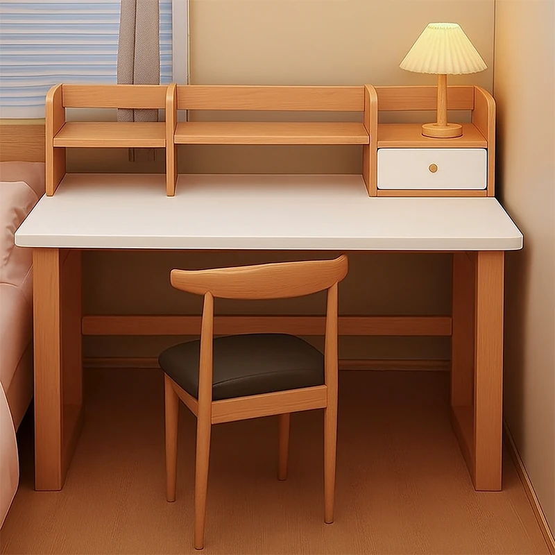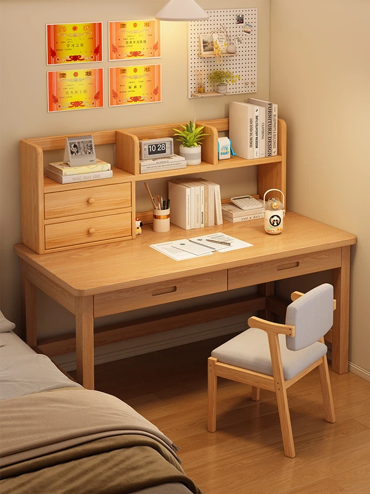 天然木材使用!実木製学習デスク・書棚一体型、引き出し付き!自宅の寝室や学生のための読書・学習・ライティングデスク。快適な学びの空間を提供します!