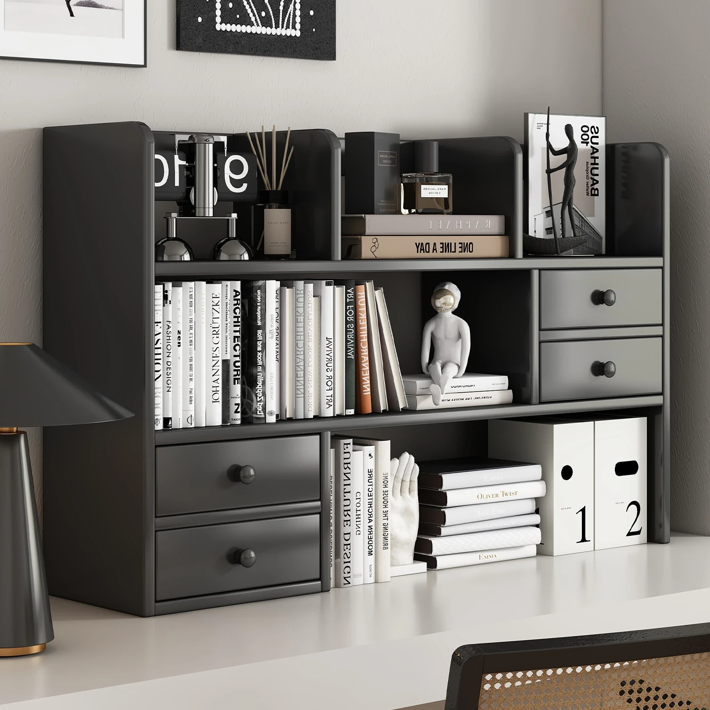 デスク上に最適!シンプルでスタイリッシュな書棚・収納ラック。オフィスやリビング、書斎にぴったりの小型収納キャビネット。すっきり整理整頓して、快適な空間を実現!